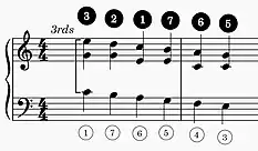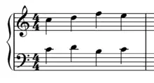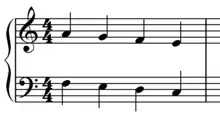 The Fenaroli features four events, with the melody featuring a descent from scale degree 4 to scale degree 3 followed by an ascent from scale degree 7 to scale degree 1.[1] The Fenaroli bass features a stepwise ascent from scale degrees 7 to 3. Another common Fenaroli melody is scale degree 2 to scale degree 3, then scale degree 7 to scale degree 1, which creates a canon with the bass.[18] A countermelody exists for the Fenaroli, as taught by Francesco Durante.[19]