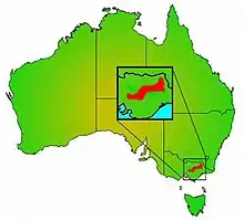 The riffle Galaxias range is confined to a narrow strip to the north of the Great Dividing Range in eastern Victoria, extending in the west to the head waters of the Golbourn river and in the east to the head waters of the Murray River. It has not yet been recorded from the Broken catchment in northern Victoria, but may be present with a restricted range limited to the cooler faster flowing areas. Not recorded in the Murray River downstream of the Albury area. May be limited to steeper streams in more upland areas by the need for variable substrates and faster water flows.[2]