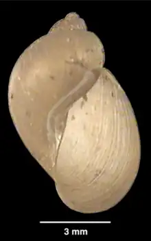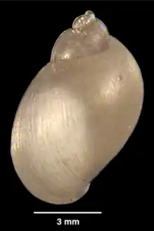 The shell is light brown, thin-walled, with a relatively short spire.[1] The apex is obtuse.[1] The shell has fine growth lines, and has only 3 whorls.[1] The body whorl dominates the shell, is inflated and separated by a deep, well-marked suture.[1] The aperture is large, oblique, oval and wide at the base.[1] The shell tends to be one and a half times as long as it is wide, and its aperture tends to be two thirds as long as the shell or more than twice as long as the spire.[1]