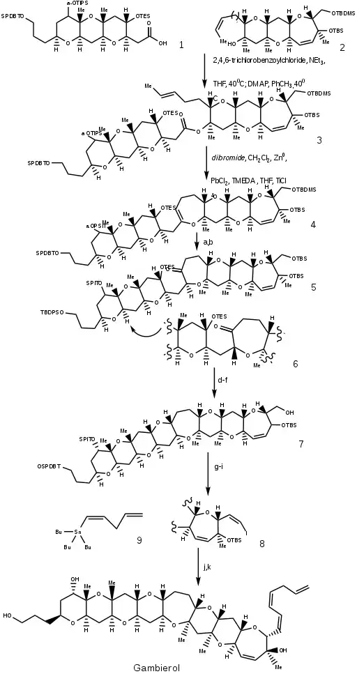 The synthesis of gambierol consists of two tetracyclic precursor molecules, one alcohol and one acetic acid, that fuse together. The whole synthesis of gambierol is depicted in the figure below. After obtaining the octacyclic backbone, the tail is added via Stille coupling. The acetic acid (compound 1) and alcohol (compound 2) are converted to compound 3. The reaction of compound 3 with the titanium alkylidene from dibromide 1,1-dibromoethane, provides cyclic enol ether (compound 4). Oxidation of the alcohols gives majorly compound 5, but also compound 6. These are both ketones, but they have other stereochemistry. Compound 6 can be converted back in compound 5 with reactant c, thereby moving the equilibrium towards compound 5. This ketone can be converted further to produce reactive gambierol. By reductive cyclization of the D ring, the octacyclic core structure (compound 7) was made. Oxidation of compound 7 to the aldehyde was followed by formation of the diiodolefin. Stereoselective reduction, global deprotection and Stille coupling of compound 8 with dienyl stannane (compound 9) provide gambierol.[7]