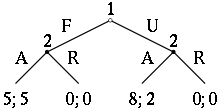 The game pictured consists of two players. The way this particular game is structured (i.e., with sequential decision making and perfect information), Player 1 "moves" first by choosing either F or U (fair or unfair). Next in the sequence, Player 2, who has now observed Player 1's move, can choose to play either A or R (accept or reject). Once Player 2 has made their choice, the game is considered finished and each player gets their respective payoff, represented in the image as two numbers, where the first number represents Player 1's payoff, and the second number represents Player 2's payoff. Suppose that Player 1 chooses U and then Player 2 chooses A: Player 1 then gets a payoff of "eight" (which in real-world terms can be interpreted in many ways, the simplest of which is in terms of money but could mean things such as eight days of vacation or eight countries conquered or even eight more opportunities to play the same game against other players) and Player 2 gets a payoff of "two".