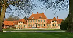 The current Neoclassical main building dates from 1791. It consists of a two-storey main wing built in red brick under a red tile roof and two lower lateral wings. The latter were altered in 1856. An interconnected wing with timber framing is the only preserved part of the previous complex from 1603.[3]