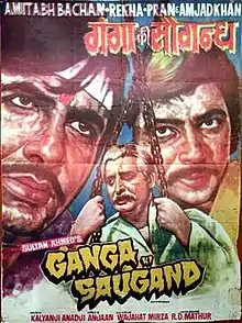 Ganga Ki Saugandh is a 1978 Hindi-language action drama film produced and directed by Sultan Ahmed. It was released on February 10, 1978.[2] The film stars Amitabh Bachchan, Rekha, Amjad Khan, Pran, I. S. Johar, Bindu, and Anju Mahendru. The title soundtrack was composed by Kalyanji-Anandji and the screenplay was written by Indian screenwriter and director Wajahat Mirza. It was a hit.[3] Irrfan Khan watched the shooting of Ganga Ki Saugandh, which took place in his hometown when he was a lad.