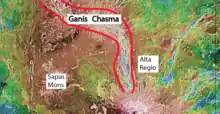 Ganis Chasma consists of a group of rift zones located in the Ganiki Planitia Quadrangle on Venus.[1] A chasma is defined as a long, narrow, steep sided depression on a planet.[2] These depressions, or canyons, formed as a result of extensional tectonics due to volcanism.[3] Ganis Chasma is associated with volcanism of Sapas Mons, a coronae feature located in the Alta Regio region of Venus. The rifts that make up Ganis Chasma formed in the shape of an arc along the edge of Sapas Mons, orientated in a north–south direction.[1]