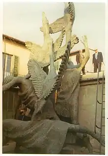 The Garden was designed by Dáithí Hanly. It is in the form of a sunken cruciform water-feature. Its focal point is a statue of the Children of Lir by Oisín Kelly, symbolising rebirth and resurrection, added in 1971,[1] cast in the Ferdinando Marinelli Artistic Foundry of Florence, Italy.