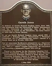 On 2 May 2006, a trilingual (English/Welsh/Ukrainian) plaque was unveiled in Jones' memory in the Old College at Aberystwyth University, in the presence of his niece Margaret Siriol Colley, and the Ukrainian Ambassador to the UK, Ihor Kharchenko, who described him as an "unsung hero of Ukraine". The idea for a plaque and funding were provided by the Ukrainian Canadian Civil Liberties Association, working in conjunction with the Association of Ukrainians in Great Britain. Dr Lubomyr Luciuk, UCCLA's director of research, spoke at the unveiling ceremony.