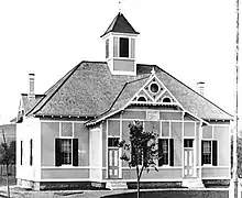 The design was originally meant to be a two-room, two-story schoolhouse, but was eventually reconfigured to be a two-room, one-story building, with classrooms located side-by-side. The main building measures about 53.5 by 29 feet (16.3 by 8.8 m). Each of the two classrooms is rectangular; they were originally separated by a sliding wall, which could be moved in the event of a large crowd or gathering. A vestibule used as a cloakroom juts out from the front about 8 feet (2.4 m); each classroom had its own entrance, which can still be seen in the photo shown above.[1]