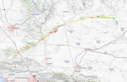 The last significant ruptures on the Garlock were thought to be in the years 1050 AD and 1500 AD. Research has pinned the interval between significant ruptures on the Garlock as being anywhere between 200 and 3,000 years, depending on the segment of the fault.[4] The most recent notable event in the Garlock Fault Zone was a magnitude 5.7 near the town of Mojave on July 11, 1992.[5] It is thought to have been triggered by the Landers earthquake, just two weeks earlier.[5] However, no surface slippage of the fault itself had been recorded in modern times until 2019. Following a series of earthquakes on nearby minor faults in late July 2019, the Garlock Fault was observed moving about 2 cm (0.8 in)[6] between July and October accompanied by numerous minor earthquakes, a state known as fault creep, and producing a bulge in land observed by satellite radar images.[6][7][8]
