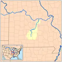 The headwaters of the Gasconade are in the southeastern corner of Webster County northeast of Seymour, Missouri where it drains the eastern margin of the Springfield Plateau at approximately 37°11′54″N 92°41′44″W / 37.19833°N 92.69556°W.[9] The river joins the Missouri River at the city of Gasconade at 38°40′28″N 91°32′55″W / 38.67444°N 91.54861°W.[10] The river follows a meandering course through the Ordovician age dolomite and sandstone bedrock of the Ozark Salem Plateau creating spectacular bluffs and incised meanders along the way.[11] Numerous springs and caves occur within the drainage area and along the river course. Significant tributaries include the Osage Fork of Webster and Laclede counties and Roubidoux Creek and Big Piney River of Texas and Pulaski counties. The Roubidoux and Big Piney flow respectively along the west and east boundaries of Fort Leonard Wood which lies a short distance south and east of the Gasconade.