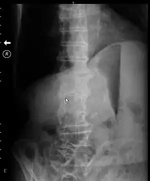 | X-ray of abdomen of a person with gastric outlet obstruction taken while on their side. There is a prominent gastric air bubble, gastric air-fluid level, and a dilated stomach with particulate matter within it. | |