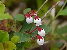 Each branch contains 1–4 nodding urceolate flowers, and there is a solitary flower on the upper leaf axil. The corolla, 6–8 mm in size, is white to faintly pinkish-white and shallowly five-lobed with slightly reflexed margins. The abaxial surface of the petals has a reddish midrib. The calyx is 3–4 mm long, vivid red and comprises 5 triangular-ovate lobes. The pedicels are 1.5–3mm long. Each flower contains 10 stamens, each around 2 mm long with awnless anthers. The pistil is 4–5 mm long and glabrous with a depressed globose ovary around 1.5 mm in diameter. The young stems, petioles, pedicels, and sepals have long hairs.[2][3]