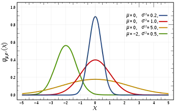 Gaussian functions are often used to represent the probability density function of a normally distributed random variable with expected value μ = b and variance σ2 = c2. In this case, the Gaussian is of the form[1]