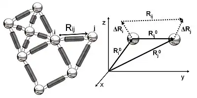 - Spring bead based network model: In spring-bead based network model, the springs and beads are used as components in the crosslinked network. Springs are cross-linked to represent mechanical behavior of the material and bridge molecular dynamics (MD) model and finite element (FE) model (see Figure. 5). The beads represent material mass of cluster bonds. Each spring is used to represent a cluster of polymer chains, instead of part of a single polymer chain. This simplification allows to bridge different models at multiple length scales and improves the simulation efficiency significantly. At each iteration step in the simulation, forces in the springs are applied to the nodes at the center of the beads, and the equilibrated nodal displacements throughout the system are calculated. Different from the traditional FE method for obtaining stress and strain, the spring–bead model provides the displacements of the nodes and forces in the springs. The equivalent strain and strain energy of spring–bead based network model can be defined and calculated using the displacements of nodes and the spring characteristics. Furthermore, the results from the network model can be scaled up to obtain the structural response at the macroscale using FE analysis.[11][12]