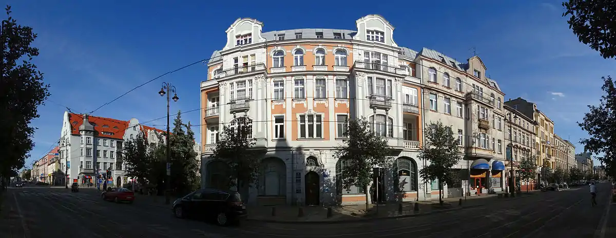 A walk through Gdańska Street and nearby areas gives an overview of styles and trends of last two centuries construction style. One-storey houses (representing suburban housing type) mix with two and three story tenements (close to 100 of them), as well as urban four and five story buildings and monumental buildings. More than 90% of the building in Gdańska Street dates back from before 1920.[2] Half of them have been built or rebuilt in the years 1890–1914, when wealthy Bydgoszcz inhabitants put proudness in architecture, fashioning different styles, from Neo-Renaissance, Neo-Gothic, Neo-Baroque, to Secession and early Modern architecture.