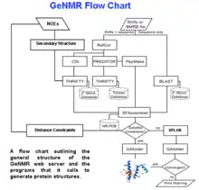 A flow chart describing the processing logic used in GeNMR is shown on the right. GeNMR makes use of a number of well-known programs and databases. These include Proteus2 to perform structural modeling, PREDITOR to calculate torsion angles from chemical shifts, PPT-DB for comparative modeling and alignment and CS23D to calculate protein structures from chemical shifts only. GeNMR also uses several well-known external programs, including Rosetta for ab initio folding without NOEs and XPLOR-NIH for NOE-based simulated annealing and refinement. A more complete list of GeNMR sub-programs is listed on the CS23D page.