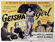 Geisha Girl is a 1952 American adventure film directed and produced by George Breakston and C. Ray Stahl, and starring Steve Forrest, Martha Hyer, Tetsu Nakamura, Heihachirō Ōkawa, and Dekao Yokoo.[1][2] The full film was shot in Tokyo, Japan. The plot was, in fact, created so as to educate American viewers of such Japanese traditions as a Kabuki theater presentation, a Buddhist religious ceremony, and a geisha house.[3][4] Despite these features, the Japanese people were presented as stock characters or buffoons.[5] Martha Hyer did not play the main role in the film, yet got the top billing.[6][7][8]