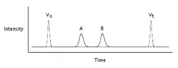If an analyte is too large relative to the column's pores, it will not be retained at all and will be totally excluded; conversely, if the analyte is small relative to the pores sizes, it will be totally permeating. Analytes that are totally excluded, elute with the free volume outside around the particles (Vo), the total exclusion limit, while analytes that are completely delayed, elute with the solvent, marking the total permeation volume of the column, including also the solvent held inside the pores (Vi). The total volume can be considered by the following equation, where Vg is the volume of the polymer gel and Vt is the total volume:[5]