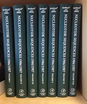 - ↑ Benton D (1990). "Recent changes in the GenBank On-line Service". Nucleic Acids Research. 18 (6): 1517–1520. doi:10.1093/nar/18.6.1517. PMC 330520. PMID 2326192.