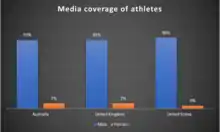 In Australia, female's sports make up 7% of all sports media coverage, the same as the United Kingdom. Similarly, in the United States, nearly 40% of athletes are female, but they own 4% of media coverage.[17] In a 2015 study, Billings and Young compared coverage of women's sports on ESPN's Sports Center and Fox Sports 1's Fox Sports Live, in which both TV programs were found to cover women's sports less than 1% of the time.[18] In the Nordic welfare states women obtain 10% of routine newspaper or TV sports coverage.[19] A 2015 analysis of International sports news websites found the three websites covering the most female athletics dedicated 7% of coverage.[20]