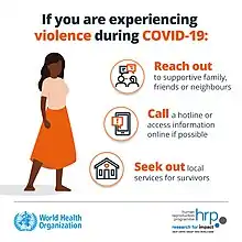 - ↑ "Gender-based violence spikes amid pandemic, shelters need support". www.unfpa.org. Archived from the original on 10 April 2020. Retrieved 7 April 2020.