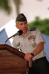 Army regulations set a so-called "ticking clock" upon promotion to a three-star general, essentially requiring that Clark be promoted to another post within two years from his initial promotion or retire.[45] This deadline ended in 1996 and Clark said he was not optimistic about receiving such a promotion because rumors at the time suggested General Dennis Reimer did not want to recommend him for promotion although "no specific reason was given".[46] According to Clark's book, General Robert H. Scales said that it was likely Clark's reputation for intelligence was responsible for feelings of resentment from other generals. Clark was named to the United States Southern Command (USSOUTHCOM) post despite these rumors. Congress approved his promotion to full general in June 1996, and General John M. Shalikashvili signed the order. Clark said he was not the original nominee, but the first officer chosen "hadn't been accepted for some reason".[46][47]