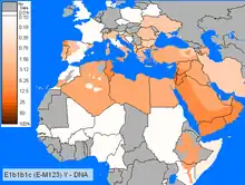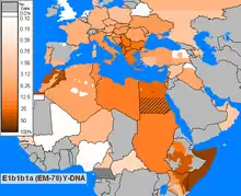 This haplogroup reaches a mean frequency of 85% in North Africa. It decreases in frequency from approximately 80% or more in some Moroccan Berber populations, including Saharawis, to approximately 28% to the east of this range in Egypt.[31][37][39]