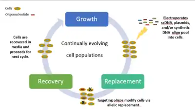 Chemically combined, synthetic single-stranded DNA (ssDNA) and a pool of oligionucleotides are introduced at targeted areas of the cell thereby creating genetic modifications. The cyclical process involves transformation of ssDNA (by electroporation) followed by outgrowth, during which bacteriophage homologous recombination proteins mediate annealing of ssDNAs to their genomic targets. Experiments targeting selective phenotypic markers are screened and identified by plating the cells on differential medias. Each cycle ultimately takes 2.5 hours to process, with additional time required to grow isogenic cultures and characterize mutations. By iteratively introducing libraries of mutagenic ssDNAs targeting multiple sites, MAGE can generate combinatorial genetic diversity in a cell population. There can be up to 50 genome edits, from single nucleotide base pairs to whole genome or gene networks simultaneously with results in a matter of days.[46]