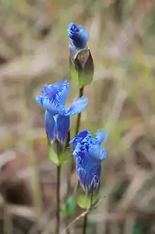 Gentianopsis crinita (sometimes called greater fringed gentian or blue gentian) is a biennial herbaceous species, native to eastern USA and eastern Canada.[1] The flowers of fringed gentian open on sunny days, but generally remain closed on cloudy days. Individual plants live for only one or two years; the plant is noted as having become relatively rare.[2] It grows in moist, limey woods, meadows, and stream banks.[3]