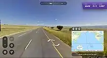 The game's HUD primarily features the Google Street View imagery, as well as a compass. Users can control the movement, panning, and zooming of the image, although GeoGuessr allows any of these features to be disabled for harder gameplay.[13] An inset map, using Google Maps's standard overlay, allows players to place a pin to make their guess.
