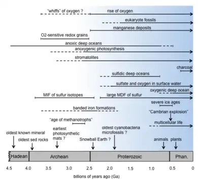 - ↑ Anbar, Ariel D.; Duan, Yun; Lyons, Timothy W.; Arnold, Gail L.; Kendall, Brian; Creaser, Robert A.; Kaufman, Alan J.; Gordon, Gwyneth W.; Scott, Clinton (2007-09-28). "A whiff of oxygen before the great oxidation event?". Science. 317 (5846): 1903–1906. Bibcode:2007Sci...317.1903A. doi:10.1126/science.1140325. ISSN 1095-9203. PMID 17901330. S2CID 25260892.