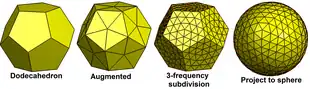 | Form | 3-frequency subdivided icosahedron | Kis truncated icosahedron | Geodesic polyhedron (3,0) | Spherical polyhedron |