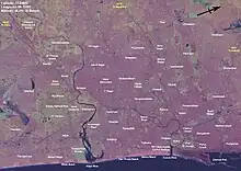 Two rivers meander through Chennai, the Cooum River (or Koovam) in the central region and the Adyar River in the southern region. Both rivers are heavily polluted with effluents and trash from domestic and commercial sources. The Adyar, which is much less polluted than the Cooum, is de-silted and cleaned periodically by the state government. A protected estuary of the Adyar forms the natural habitat of several species of birds and animals. The Buckingham Canal, 4 km (2.5 mi) inland, travels parallel to the coast, linking the two rivers. The Otteri Nullah, an east–west stream runs through north Chennai and meets the Buckingham Canal at Basin Bridge.[10] Several lakes of varying size are located on the western fringes of the city. Red Hills, Sholavaram and Chembarambakkam Lake supply Chennai with potable water. Groundwater sources are mostly brackish. A study by the Department of Geology, Anna University, based on a city map of 1893, has revealed that there were nearly 60 large waterbodies in the core of then Madras.[11] The study traced the shrinking and vanished waterbodies through a series of city maps.[12]