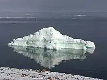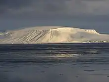 Hall Island (Ostrov Gallya) is an almost completely glacierized large island of 1,049 km2 (405 sq mi) immediately to the east of MacKlintok Island. It lies within latitude 80.30° N and longitude 56.00° E. The highest point on the island is 502 m (1,647 ft) and its mapped shore length is 174.7 km (108.6 mi).[10][22] It was named after American Arctic explorer Charles Francis Hall. The only relatively large areas free of permanent ice are located in its southern end, where there are two headlands, Cape Tegetthoff, and Cape Ozernyy, on the Littov Peninsula. Cape Tegetthoff has a range of hill peaks.[7] The airborne surveys revealed 400 metres (1,300 ft) thick mantles of ice and also in Graham Bell Island's ice capes.[23] There is also a very small unglacierized area around its eastern cape, Cape Frankfurt, and another in its northwestern point, Cape Wiggins. Its highest point is 502 m (1,647 ft) near its southwestern side, and there is also a peak of 421 metres (1,381 ft) in the northcentral part of the island. There is a wide bay on the southeastern side of Hall Island known as Hydrographer Bay and a smaller one west of the Littov Peninsula, known as Bukhta Surovaya.[7] To the southeast, there is a wider strait separating Hall Island from Salm Island, known as Proliv Lavroka. The strait to the east is known as Austrian Strait.