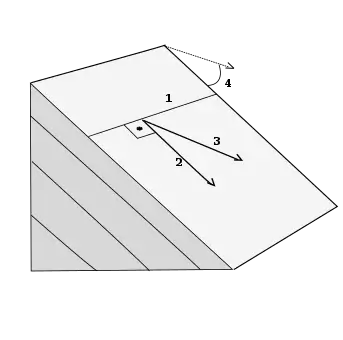 Rock plane orientations are the natural inclinations that occurred on a rock plane.[8] Some examples of rock planes are bedding planes, fault planes. The planes' orientations are measured by dip and dip direction with a clinometer and compass, where dip represents the maximum inclination of a plane to the horizontal, dip direction is the direction of the intersection line between horizontal and the inclined plane.[9] A stereonet can visualise the distribution of dip and dip directions to analyse the kinematics of a slope.[9]