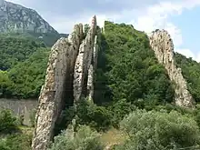 In the east, particularly within the East Balkan Range, are olistolith remnants as an allochthon of Triassic rocks in Middle Jurassic black shales. Triassic rocks include turbidite sandstone and sub-reefal limestone. In Srednogorie, they form a sizeable nappe with phyllite, amphibolite, calcareous schist and turbidites as well as marble.