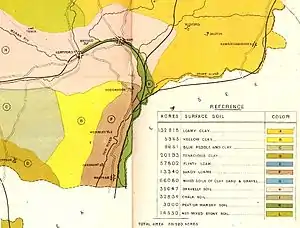 At the retreat of the glaciers, wind blown powdered rock known as loess was deposited over the whole county, forming thin layers under a metre thick. This reddish clay is easily formed into bricks at the lowish temperatures attainable in a wood-fired kiln and gained the name brickearth. It gave rise to rural brick-making industries scattered throughout the county. It also makes for fine, easily cultivated and fertile soils.[2][3]