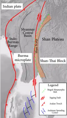 The geology of Myanmar is shaped by dramatic, ongoing tectonic processes controlled by shifting tectonic components as the Indian plate slides northwards and towards Southeast Asia.[1] Myanmar spans across parts of three tectonic plates (the Indian Plate, Burma microplate and Shan Thai Block) separated by north-trending faults. To the west, a highly oblique subduction zone separates the offshore Indian plate from the Burma microplate, which underlies most of the country. In the center-east of Myanmar, a right lateral strike slip fault extends from south to north across more than 1,000 km (620 mi).[2] These tectonic zones are responsible for large earthquakes in the region.[1] The India-Eurasia plate collision which initiated in the Eocene provides the last geological pieces of Myanmar,[3] and thus Myanmar preserves a more extensive Cenozoic geological record as compared to records of the Mesozoic and Paleozoic eras. Myanmar is physiographically divided into three regions: the Indo-Burman Range, Myanmar Central Belt and the Shan Plateau;[4] these all display an arcuate shape bulging westwards. The varying regional tectonic settings of Myanmar not only give rise to disparate regional features, but they also foster the formation of petroleum basins and a diverse mix of mineral resources.[5]