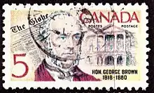 George Brown (November 29, 1818 – May 9, 1880) was a British-Canadian journalist, politician and one of the Fathers of Confederation. He attended the Charlottetown (September 1864) and Quebec (October 1864) conferences.[1] A noted Reform politician, he is best known as the founder and editor of the Toronto Globe, Canada's most influential newspaper at the time, and his leadership in the founding of the Liberal Party in 1867. He was an articulate champion of the grievances and anger of Upper Canada (Ontario). He played a major role in securing national unity. His career in active politics faltered after 1865, but he remained a powerful spokesman for the Liberal Party. He promoted westward expansion and opposed the policies of Conservative Prime Minister John A. Macdonald.