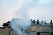 Late at night on May 28, the focus of demonstrators shifted to the Minneapolis third precinct police station building at the intersection of East Lake Street and Minnehaha Avenue.[95] Some protesters threw objects at the officers guarding the building, who responded by firing rubber bullets in the crowd.[30] Demonstrators began tearing down fencing that surrounded the precinct station and police responded with tear gas.[95][90] As tensions in the area mounted, Frey gave the order to evacuate the station, a tactic he later said was to deescalate the situation and prevent further loss of life.[95][90]