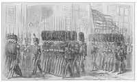 During the mid-1850s public order in Baltimore was threatened by the election of candidates of the Know Nothing party.[27] In October 1856 the Know Nothing Mayor Samuel Hinks was pressed by Baltimorians to order Steuart's militia in readiness to maintain order during the mayoral elections, as violence was anticipated. Hinks duly gave Steuart the order, writing that he should "hold yourself with your command, or such portion thereof as you may deem necessary, in readiness to march at a moment's warning, fully armed and equipped for active service".[28] In response, Steuart ordered his men to "assemble in marching order" on November 4 and await further orders.[28] However, perhaps fearful of greater violence, the mayor soon rescinded his order.[29] On October 31 he met with Steuart and requested that the general make his soldiers ready, but not assembled, and Steuart duly countermanded his original order.[28] On polling day violence soon broke out, with shots exchanged by competing mobs.[29] In the 2nd and 8th wards several citizens were killed, and many wounded.[30] In the 6th ward artillery was used, and a pitched battle fought on Orleans St between Know Nothings and rival Democrats, raging for several hours.[30] The result of the election, in which voter fraud was widespread, was a victory for the Know Nothings by around 9,000 votes.[30]