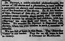 Steuart's family were slaveholders and strong supporters of the South's "peculiar institution", although they supported the gradual abolition of slavery by voluntary means. In 1828 Steuart served on the board of managers of the Maryland State Colonization Society, of which Charles Carroll of Carrollton, one of the co-signers of the Declaration of Independence, was president. Steuart's father, James Steuart, was vice-president, and his brother Richard Sprigg Steuart was also on the board of managers.[33] The MSCS was a branch of the American Colonization Society, an organization dedicated to returning black Americans to lead free lives in African states such as Liberia. The society proposed from the outset "to be a remedy for slavery", and declared in 1833: