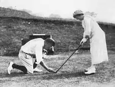 Low giving a golf lesson to a woman at Baltusrol (c.1912)