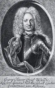 George Oliver Walsh, Count of Wallis (German: Georg Olivier Graf von Wallis, Freiherr von Carrighmain; 1671, in Vienna – 19 December 1743, in Vienna) was a field marshal of Irish descent in the service of the Holy Roman Empire and the Kingdom of the Two Sicilies and last regent of the Habsburg Kingdom of Serbia (1738–1739). Born into an exiled Irish family, he distinguished himself in Sicily by his capture of Messina. He then commanded on the Rhine (1733), then in Italy and Hungary. He lost the decisive Battle of Grocka against the Ottoman Empire in 1739, thus leading to the peace of Belgrade, which was unfavourable to Austria and thus led to his disgrace.