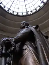 As Vincennes grew in the 1800s, it overran the site of Fort Sackville and its boundaries were lost. In 1905, the Daughters of the American Revolution placed a stone marker on what they believed was the location of the fort. In 1929, local residents made a major effort to commemorate the 150th anniversary of Clark's campaign. The state of Indiana chose to build a memorial to General Clark's triumph in the 1930s, with the assistance of the United States government; the various funds amounted to $2.5 million. The memorial was designed by New York architect Frederic Charles Hirons and dedicated June 14, 1936, by President Franklin Roosevelt.[5][6] Though the National Park Service in 1976 called the finished memorial the "last major Classical style memorial" constructed in the United States, the New York State Memorial to Theodore Roosevelt at the American Museum of Natural History by John Russell Pope was also completed in 1936, and Pope's Jefferson Memorial in Washington, D.C. was completed 1939-1943, are of the same era.[7]