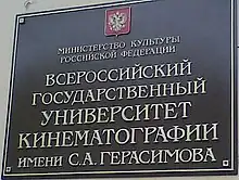 The Gerasimov Institute of Cinematography, officially the S. A. Gerasimov All-Russian University of Cinematography (Russian: Всероссийский государственный институт кинематографии имени С. А. Герасимова, romanized: Vserossiyskiy gosudarstvyennyy institut kinematografii imyeni S. A. Gerasimova, meaning All-Russian State Institute of Cinematography named after S. A. Gerasimov), a.k.a. VGIK, is a film school in Moscow, Russia.[1][2]