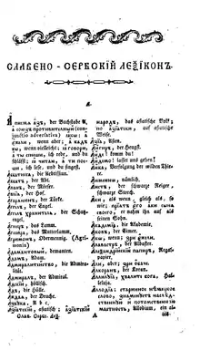 After an agreement with Metropolitan Putnik, Joseph Kurzböck undertook the project of producing a German dictionary for the Serbian people.[14] The quickest and least costly way to do that was to adapt an existing work. At that time, highly regarded as the German–Russian bidirectional dictionary composed by Jacob Rodde in Riga and printed in 1784 in Leipzig.[15] Kurzbeck entrusted his proofreader Teodor Avramović with the job of adapting Jacob Rodde's work into Slavonic-Serbian.[14] Avramović was helped by Atanasije Dimitrijević Sekereš,[16] the censor of the Cyrillic books installed by the Habsburg court in 1772.[17][18] Sekereš began composing his Slavonic-Serbian dictionary in 1775, using five Russian dictionaries as sources, but he later abandoned that work.[16]