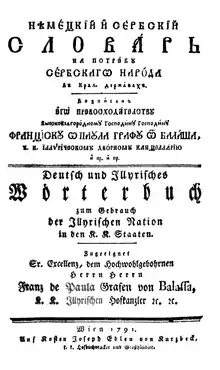 The 1791 German–Serbian dictionary, referred to as the Avramović Dictionary (Serbian: Аврамовићев речник or Avramovićev rečnik; full title in German: Deutsch und Illyrisches Wörterbuch zum Gebrauch der Illyrischen Nation in den K. K. Staaten; full title in Slavonic-Serbian: Нѣмецкïй и сербскïй словарь на потребу сербскагѡ народа въ крал. державахъ, transliterated as Německij i serbskij slovar' na potrebu serbskago naroda v kral deržavah, meaning "German and Serbian Dictionary for Use by the Serbian People in the Royal States"), is a historical bidirectional translation dictionary published in the Habsburg Empire's capital of Vienna in 1791, though 1790 is given as the year of publication in some of its copies. Containing around 20,000 headwords in each direction, it is the largest Serbian dictionary of the 18th century. Vuk Karadžić possibly used it as a source for his Serbian Dictionary, which first appeared in 1818 as the first book in modern literary Serbian.