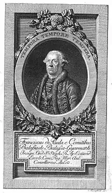 The printing of the Avramović Dictionary began at the end of 1789.[14] In February 1790, Kurzböck requested and received Metropolitan Putnik's permission to dedicate the book to him.[16] After the metropolitan died on 9 July 1790, Kurzböck stopped its printing. Emanuilo Janković, whose petition to found a Serbian printing house in Novi Sad was rejected, criticized the dictionary and Kurzböck's Cyrillic production in general; he owned a press in Leipzig. The new Metropolitan of Karlovci, Stefan Stratimirović, was elected in November 1790, and he approved the dictionary at Kurzböck's request. Its printing was then resumed and completed in the first half of May 1791. Kurzböck sent a copy to Count Francis Balassa, the head of the Illyrian Court Chancellery,[14] which was a Habsburg ministry focused primarily on the Serbs.[13] Kurzbeck requested and received Balassa's permission to include a dedication to him and his portrait in the dictionary.[14] The book appeared at the end of July 1791; its price was 7 florins and 30 kreutzers.[19]