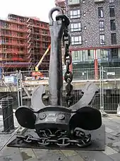 Blücher was ordered by the Kriegsmarine from the Deutsche Werke shipyard in Kiel.[4] Her keel was laid down on 15 August 1936,[9] under construction number 246.[4] The ship was launched on 8 June 1937, and was completed slightly over two years later, on 20 September 1939, the day she was commissioned into the German fleet.[10] The commanding admiral of the Marinestation der Ostsee (Baltic Naval Station), Admiral Conrad Albrecht, gave the christening speech. Mrs. Erdmann, widow of Fregattenkapitän (Frigate Captain) Alexander Erdmann, former commander of SMS Blücher who had died in the ship's sinking, performed the christening.[11] As built, the ship had a straight stem, though after her launch this was replaced with a clipper bow increasing the overall length to 205.90 meters (675.5 ft).[3] A raked funnel cap was also installed.[12]
