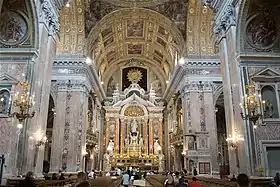 The vault frescos, representing biblical and saintly narratives that exalt the name of Jesus, were carried out by Belisario Corenzio and Paolo de Matteis. At the back of the facade is The Expulsion of Heliodorus from the Temple (1725), a baroque masterpiece by Francesco Solimena. On the four pillars which support the dome are frescos of the four Evangelists, carried out by Giovanni Lanfranco. The inside of the dome had also been decorated by Lanfranco, but this was destroyed in the earthquake of 1688. Paolo de Matteis then repainted a new dome.[2][3] The frescos of the life of the Virgin, placed on the second part of the vault up to the apse, are by Massimo Stanzione.